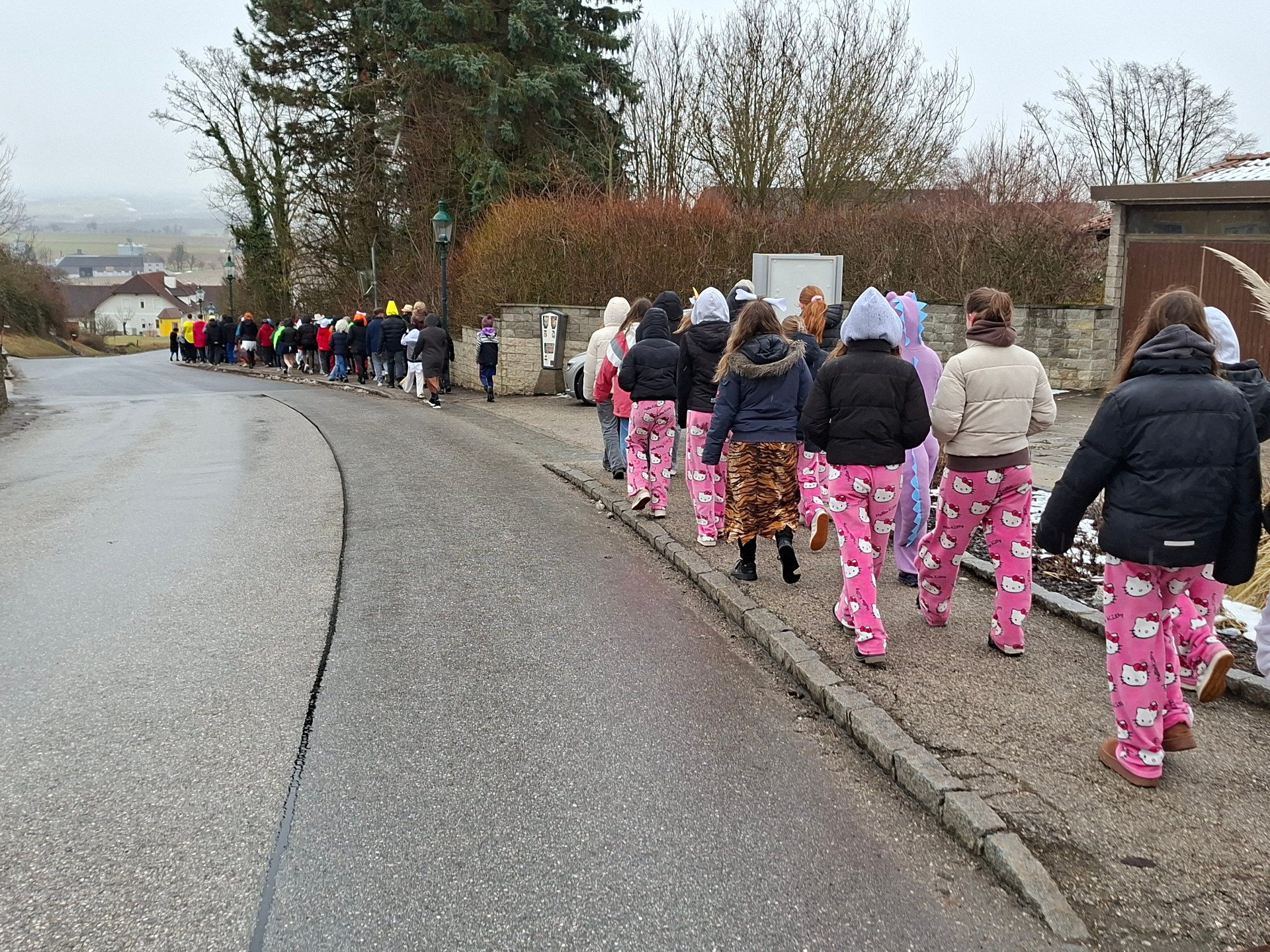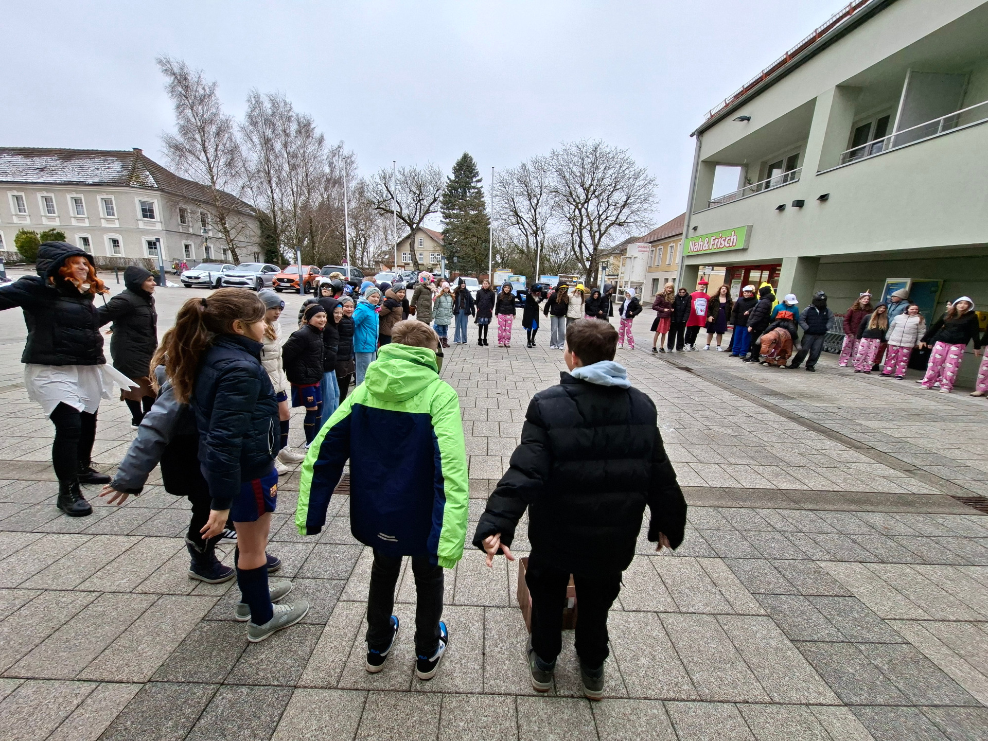 Ein besonderes Highlight war der Faschingsumzug zum Marktplatz, wo uns Frau Daniela Lichtenberger mit leckeren Krapfen, die uns der Elternverein spendierte, erwartete. Die süße Stärkung kam genau richtig und sorgte für neue Energie.